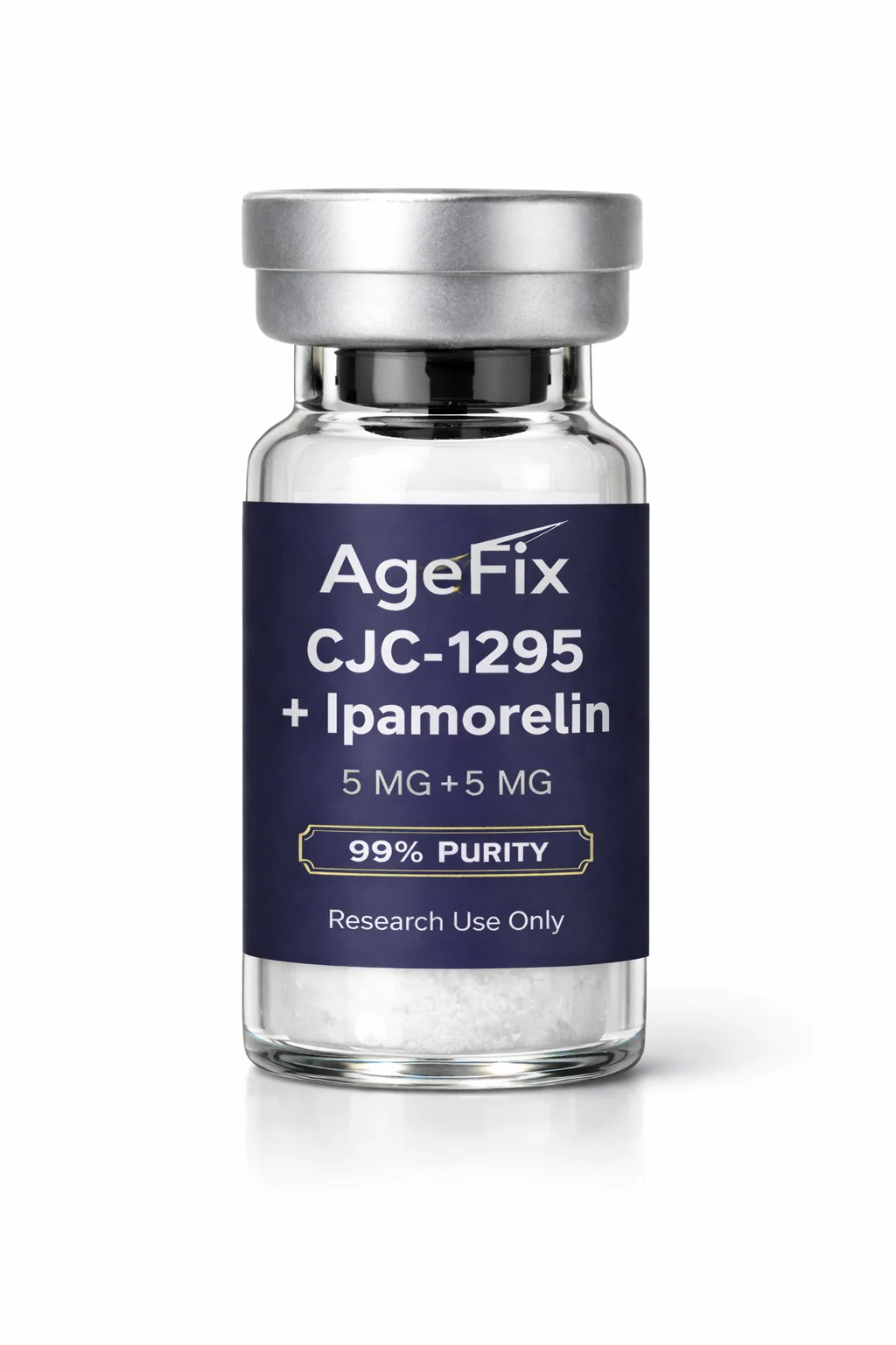 Each vial contains a balanced 5 mg/5 mg ratio of CJC-1295 (No DAC) and Ipamorelin, manufactured in the USA under ISO-certified conditions. Verified to ≥99% purity by HPLC analysis. Certificate of Analysis (COA) available upon request. For laboratory research use only.